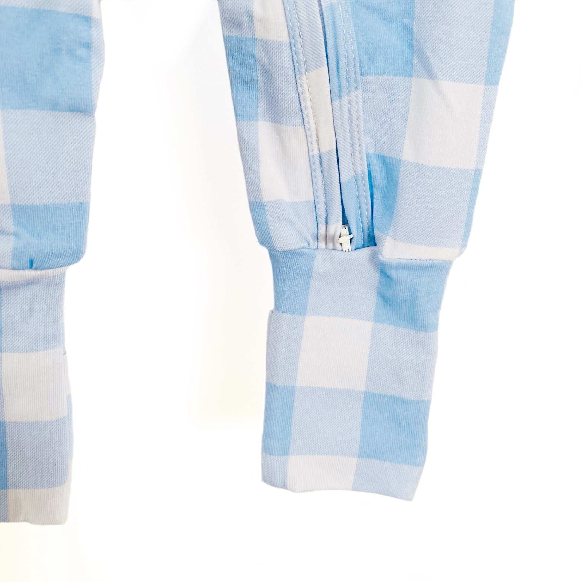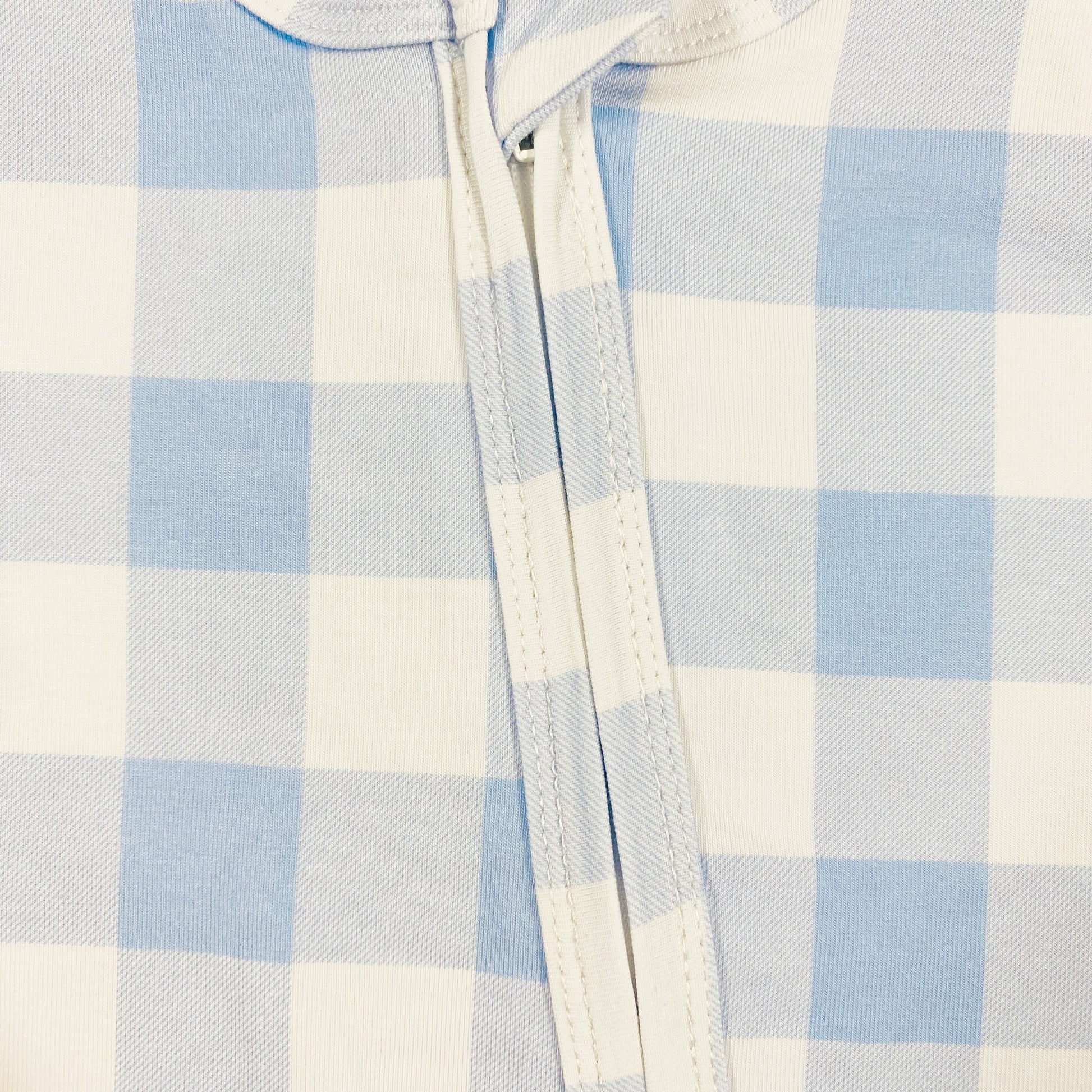 Dress your little one in comfort and style with our modern gender-neutral design featuring a classic baby blue and white gingham pattern.