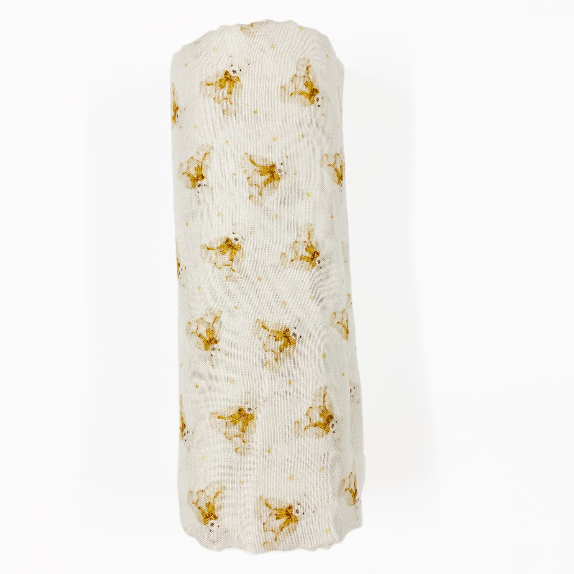 Wrap your little one in comfort and style with our Charlie Bear gender-neutral design featuring teddy bears and stars on a neutral background.