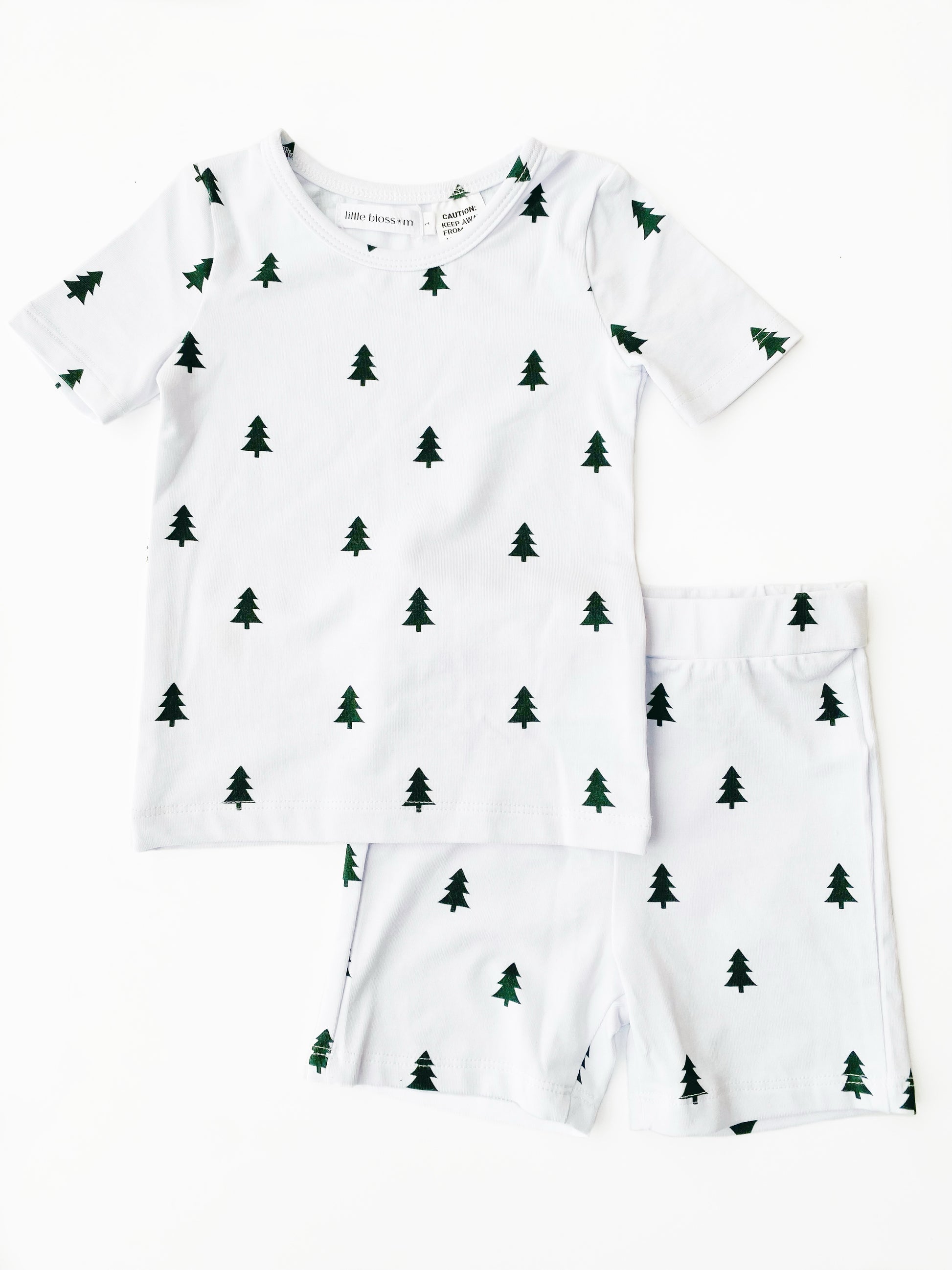 Dress your little one in comfort and style with our modern gender-neutral design featuring little evergreen trees on a white background.