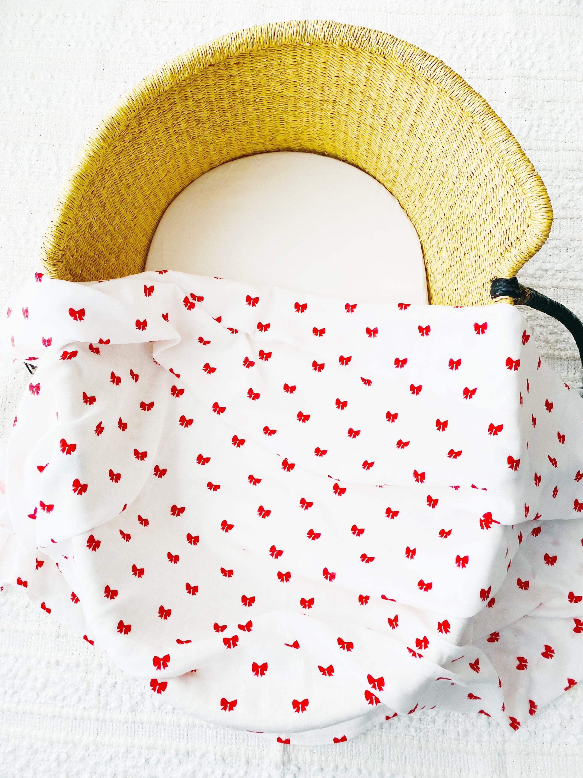 Wrap your little one in comfort and style with our sweet and dainty design featuring mini red bows on a white background