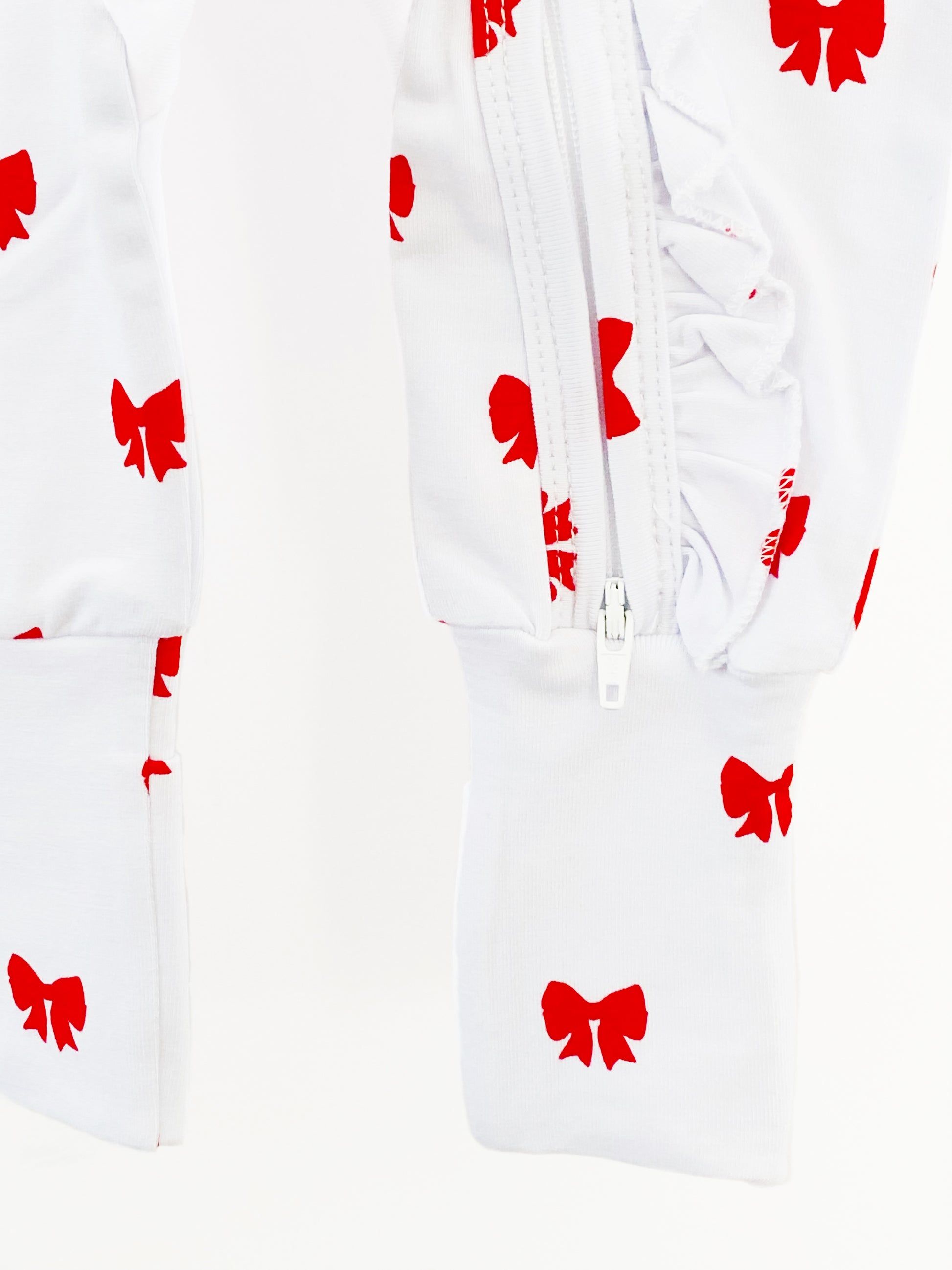 Dress your little one in comfort and style with our sweet and dainty design featuring mini red bows on a white background.