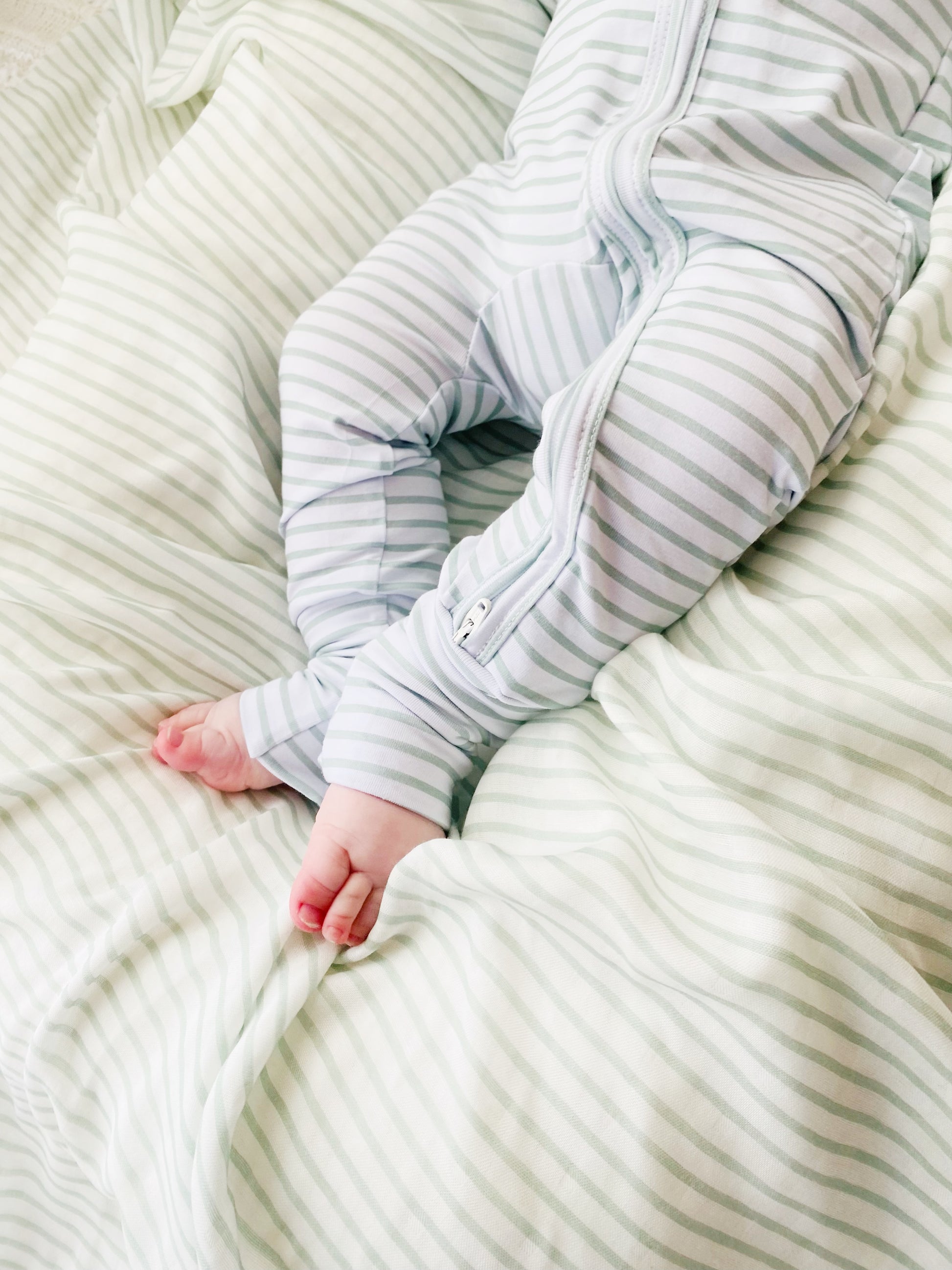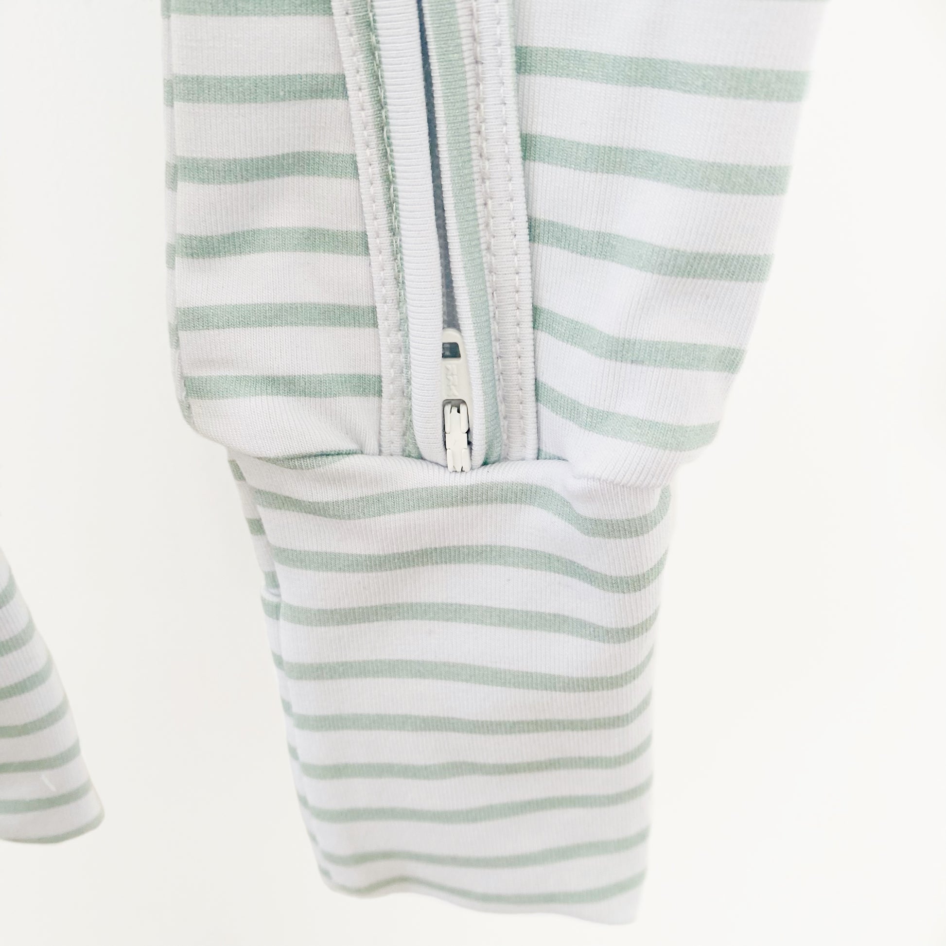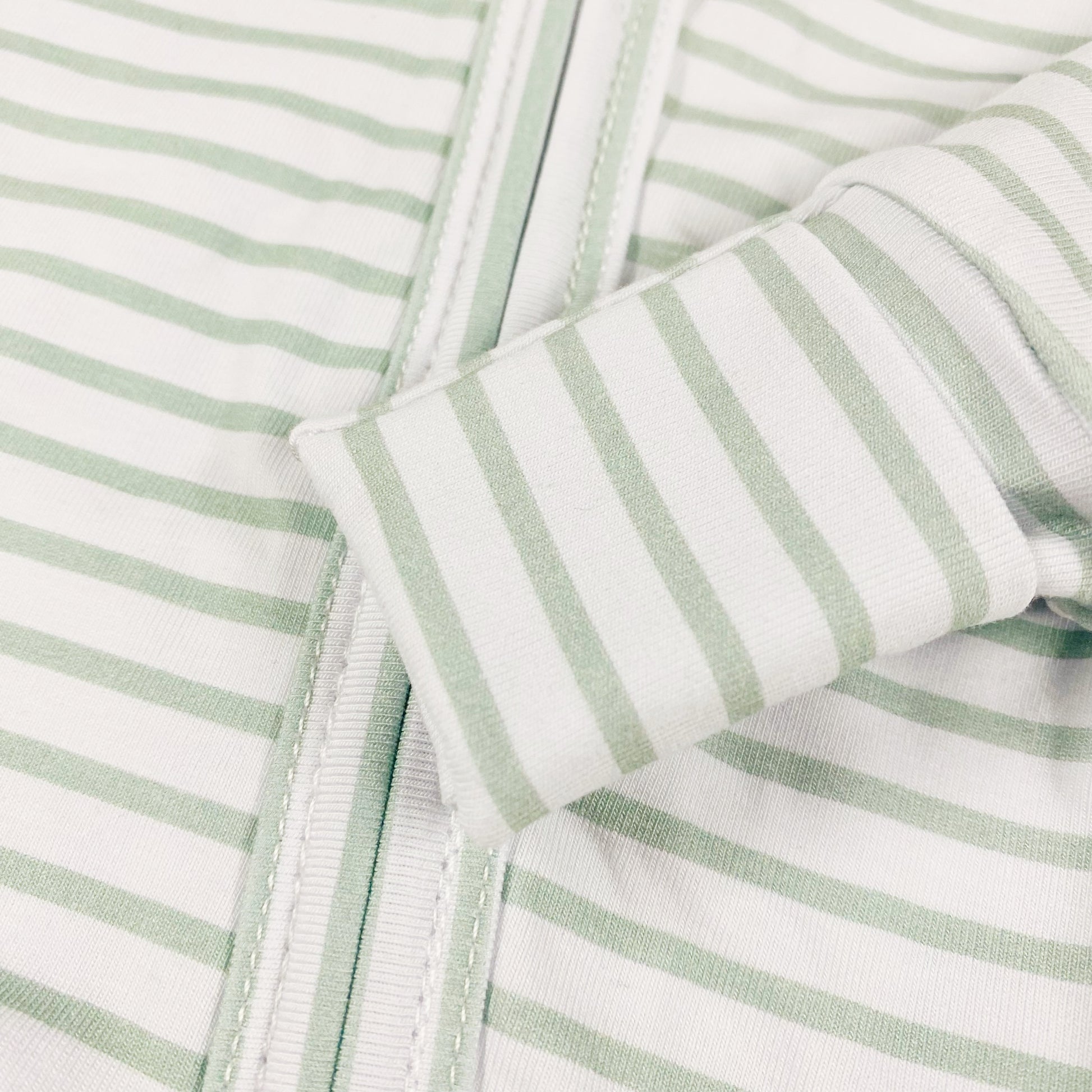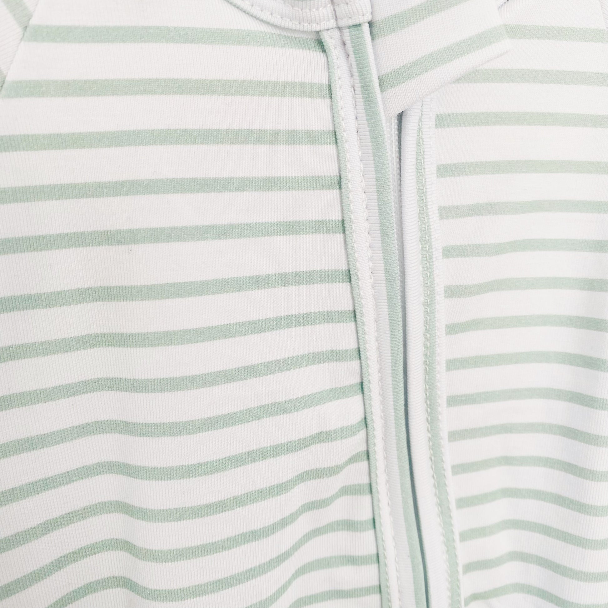 Dress your little one in comfort and style with our modern gender-neutral design featuring calming sage stripes on a white background.
